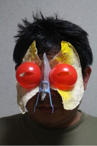 今日も1日仕事。 お面制作で出たカケラと失敗した目を組み合わせた。いつも写真をとってもらうカミさんに仮面ライダーっぽいと言われた。いつも言われる。