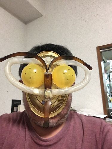 お面の整理をしている。このお面は全ての部品がとれていた。接着して新たに再生した。